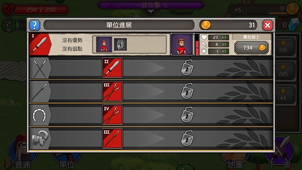 3、晋级部队能够增加部队攻击力并解锁更多兵种,兵种有各自的特性并且存在抑制关系,游戏有多种部队,如禁卫步兵、重装步兵、标枪步兵等。